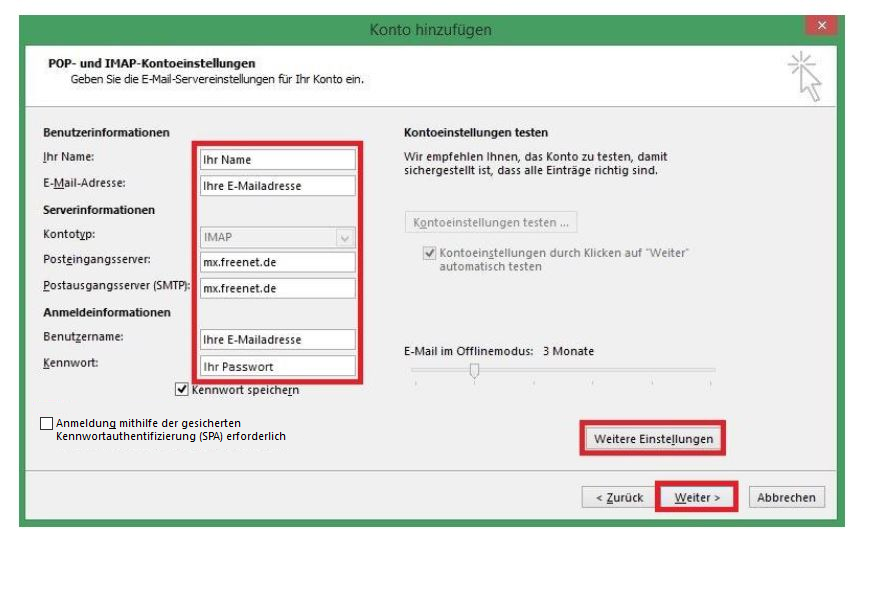 Gebe Deine Daten gemäß der Vorlage ein und klicke anschließend auf „Weitere Einstellungen“: